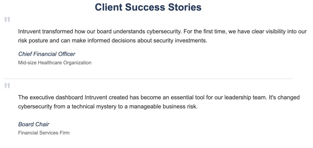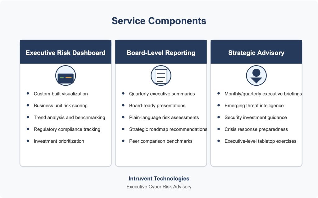 Intruvent’s Executive Cyber Risk Advisory service bridges this critical gap, providing clear, strategic guidance that enables leadership teams to make informed decisions about cyber risk.